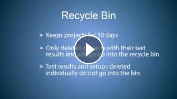 Recycle Bin: when you delete a project, it goes into the recycle bin. the recycle bin keeps deleted projects for 30 days Note that only deleted projects with their test results and test setups go into the recycle bin. when you delete individual test results or setups those do not go into the recycle bin . To restore a project click show recycle bin on the dashboard then click the restore button next to the project.