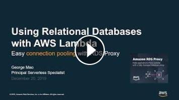 Amazon RDS Proxy is a connection pooling service for relational databases. RDS Proxy enables you to use AWS Lambda to build highly scalable applications using supported relational database management services (RDBMS) such as Aurora MySQL and RDS MySQL. In this tech talk, you will learn how to use Amazon RDS Proxy with AWS Lambda to access a relational database, enabling you to easily build serverless applications that require stateful connections to relational databases.