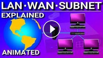 This is an animated video explaining the difference between a LAN (local area network), WAN (wide area network), and a subnet (subnetwork).