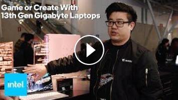 We're mobile at PAX East with Kevin Shieh from Gigabyte to check out their latest designs with 13th Gen Intel Core mobile processors. The Aorus 17X gaming laptop opens with a top-of-the-line Core i9-13980HX flexing 24 cores and 32 threads, and it's paired with a 240Hz QHD display that can dynamically switch between the integrated and discrete GPU based on the application. For creators on the go, the Aero 14 slips a Core i7-13700H into a slim, CNC-machined aluminum chassis alongside a vibrant OLED screen with individually certified color accuracy.