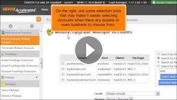 Multi-account functions allow you to work with several of your hosting accounts at once. You have two tools to choose from, ""Modify/Upgrade Multiple Accounts"" and "Terminate Multiple Accounts".
