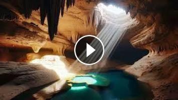 A cavern lit by shafts of light revealing hidden underground pools, camera rolls anti-clockwise.